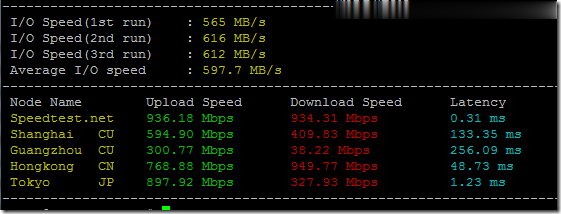 第二次测试,结果与第一次差不多,下面的带宽测试中加入了大量中国大陆节点,这个带宽还行。