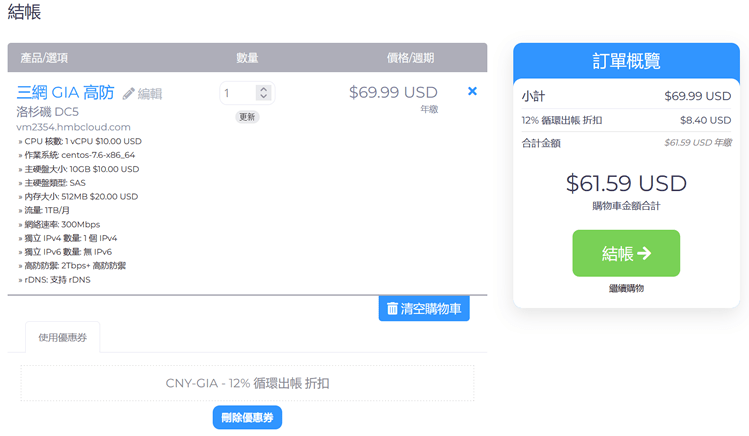 上面的方案我们看到是不同的带宽价格不同,最高可以选择1Gbps带宽,我们也可以选择300M和500M带宽,300M带宽优惠后是61.59美元一年。