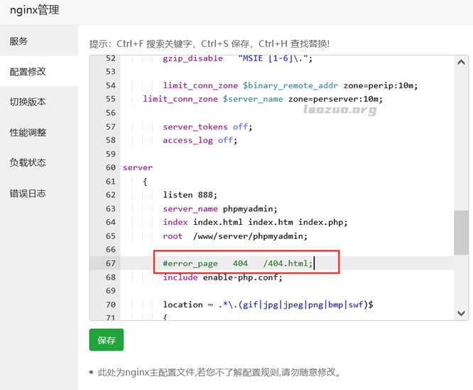 这里我们找到当前宝塔面板的Nginx引擎。然后在配置修改中查看代码,不要慌,不复杂。