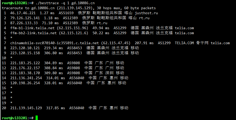 莫斯科电信到北京电信,然后到广州电信,接着广州联通: